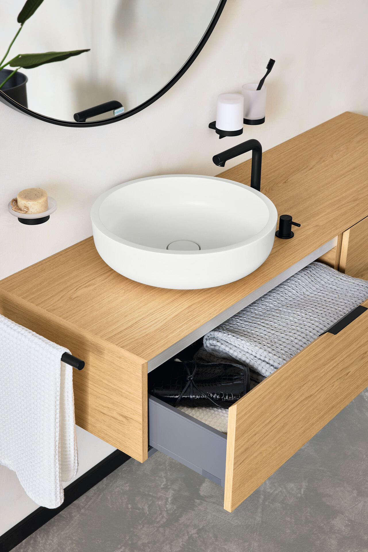 Das puristische Design von white unterliegt keinen Trends, sondern besticht auch über Jahrzehnte hinweg. Der Aspekt der Langlebigkeit findet sich auch in der Auswahl der Materialien wieder. Mit dem Einsatz von Mineralwerkstoff, Echtholz und ökologischen Lacken wird ein nachhaltiger Akzent gesetzt.